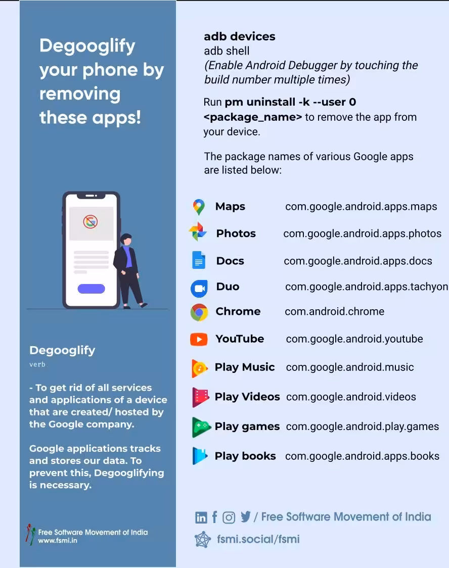 The following image has commands that can be used to uninstall Google apps.